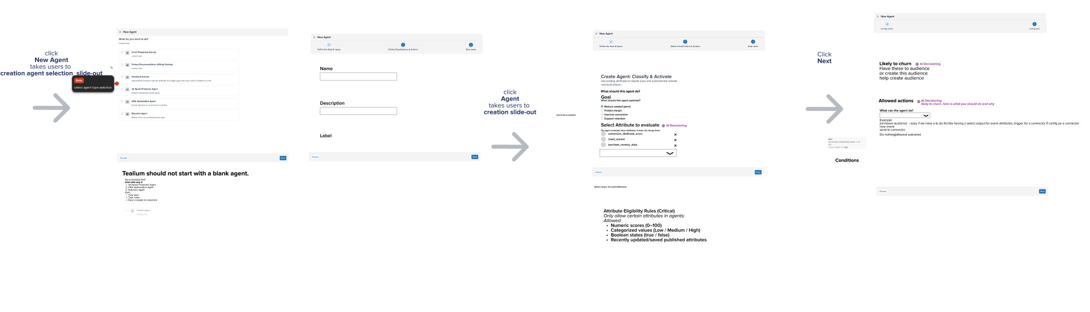 A summary slide-out appears after agent creation as a quick decision checkpoint